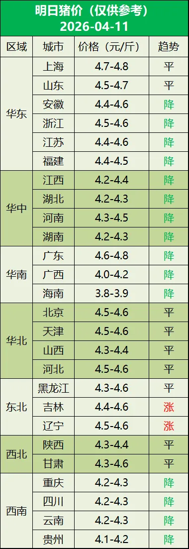 明日猪价(2026年04月11日) 养羊网 2026-04-10 明日猪价(2026年04月11日) 养羊网 2026-04-10 上一篇:开洲九鼎 猪价播报(2026.4.11) 下一篇:2026. 04. 11 明日全国猪价 ! 您可能还会对下面的文章感兴趣111: 相关文章 3.8 猪价跌势收窄!横盘筑底格局确认,收储何时破局? 养过羊咩咩才知道的事 2025年4月13日全国各地生猪价格信息 近期价格更新!!!