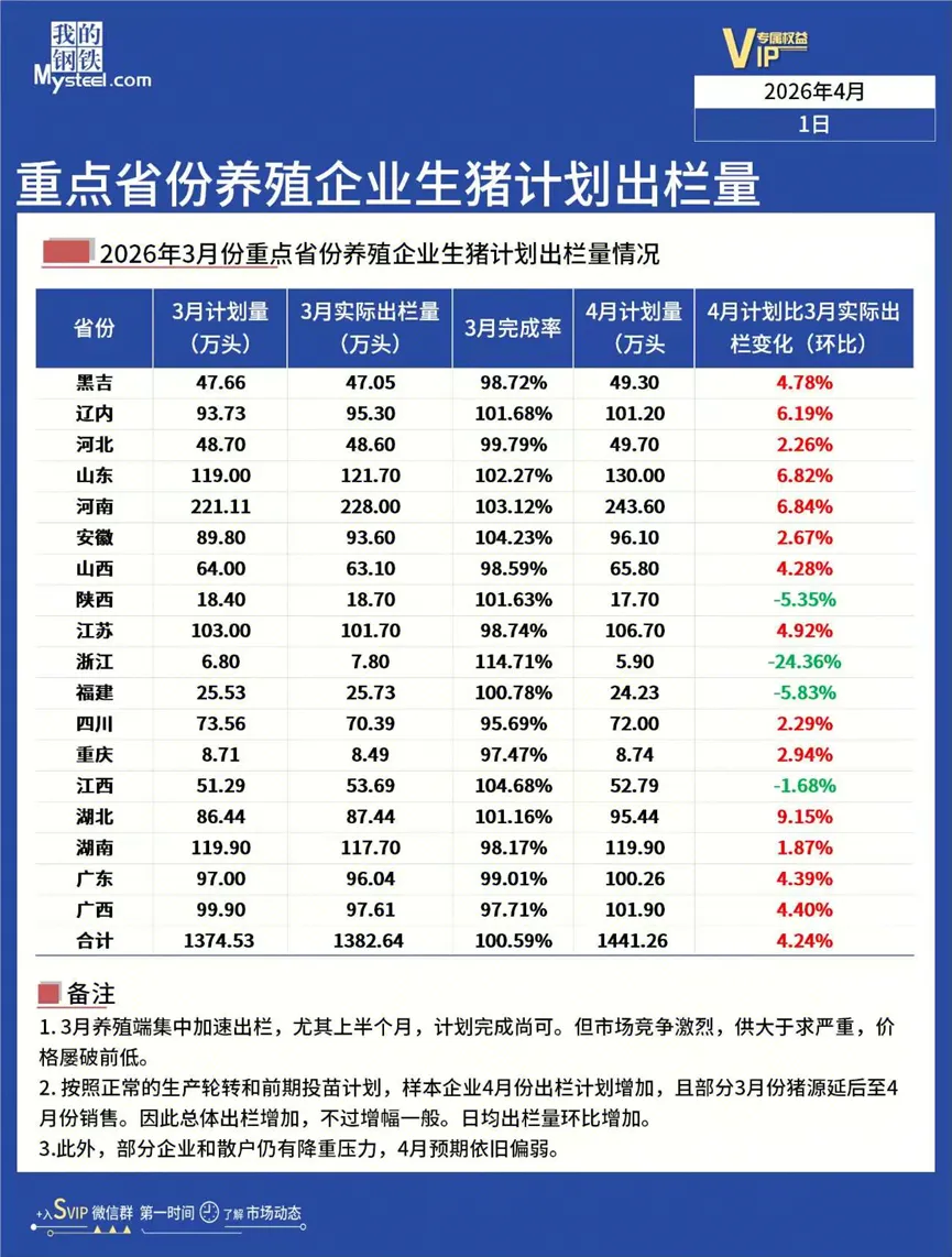 供给端:行业产能集中释放,前期能繁母猪存栏量长期处于高位,按10个月养殖周期推算,2026年上半年生猪出栏量整体维持高位水平。据Mysteel农产品监测数据显示,4月样本养殖企业计划出栏量达1441.26万头,环比增4.24%,叠加3月份猪源延后至4月份销售,市场整体供应压力进一步加大。