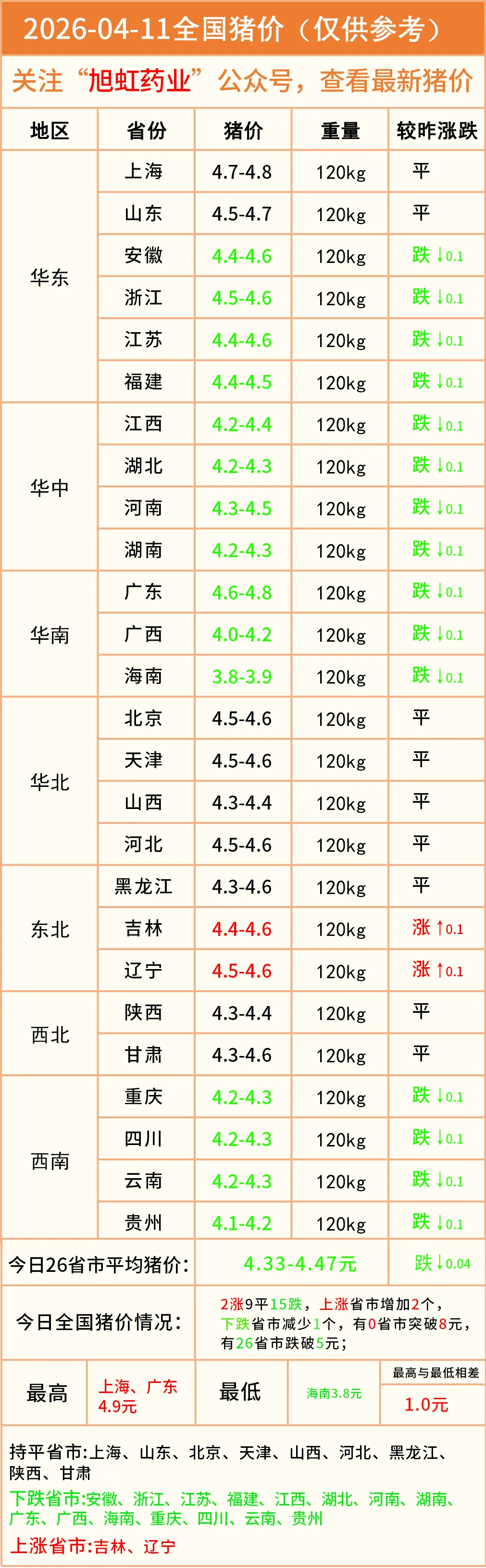 明日猪价——2026年04月11全国生猪价格! 养羊网 2026-04-10 明日猪价——2026年04月11全国生猪价格! 养羊网 2026-04-10 上一篇:【明日猪价】4月11日(涨涨涨,北方启涨!全国猪价最新报价!) 下一篇:2026年4月11日的猪价相关情况 您可能还会对下面的文章感兴趣111: 相关文章 牛羊肉最新价格表 东方甄选好物~谷物鸡蛋 2025年4月13日全国各地生猪价格信息 2026.2.3-今日猪价