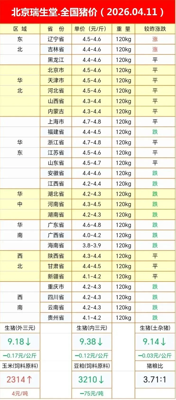 【每日猪价】北京瑞生堂猪价(2026-04-11)全国猪价