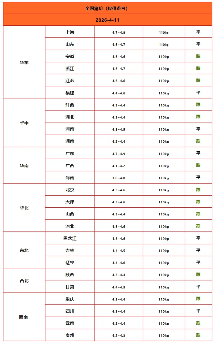 2026年04月11日全国猪价行情表 养羊网 2026-04-10 2026年04月11日全国猪价行情表以上内容源于网络,如有侵权请与我们联系,将及时删除。来源丨 畜禽报价 养羊网 2026-04-10 上一篇:【明日猪价】跌涨调整,2地飘红 下一篇:2026年4月10日东莞信立鸡蛋价格早报 您可能还会对下面的文章感兴趣111: 相关文章 近期价格更新!!! 【悦丰饲料】2026年3月28日猪价播报 双十一熟自制人狂喜 你们能想到的关于钢格栅的事儿