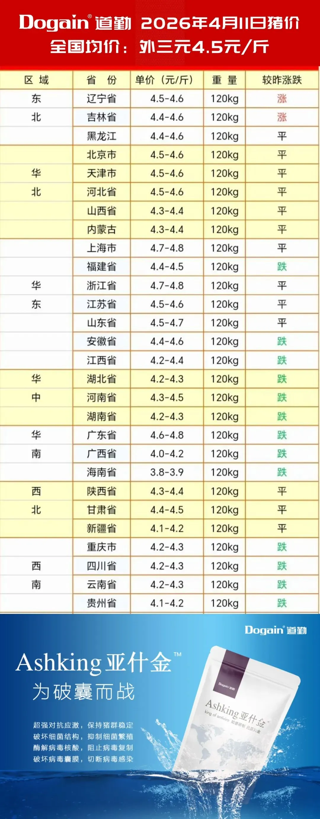 4月11日,猪价信息 养羊网 2026-04-10 4月11日,猪价信息 养羊网 2026-04-10 上一篇:猪价跌穿成本线,猪肉股为何逆势“狂欢”? 下一篇:2026.4.11明日最新猪价 您可能还会对下面的文章感兴趣111: 相关文章 封闭式管理养猪场 咩咩羊 大涨!2026年1月8日猪价行情信息 鸡蛋价格