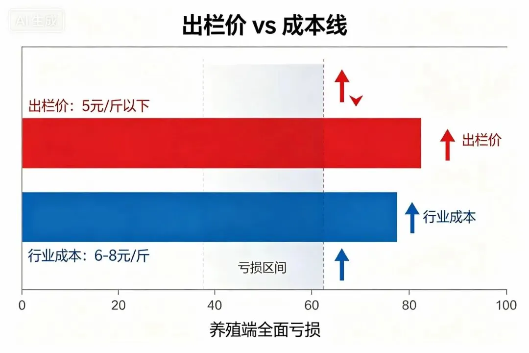 今年3月底以来,国内生猪出栏价持续走低,已普遍跌破每斤5元,触及七年来的价格新低。部分地区甚至逼近4.5元/斤,而行业平均完全成本仍维持在6-8元/斤区间,养殖端陷入全面亏损。