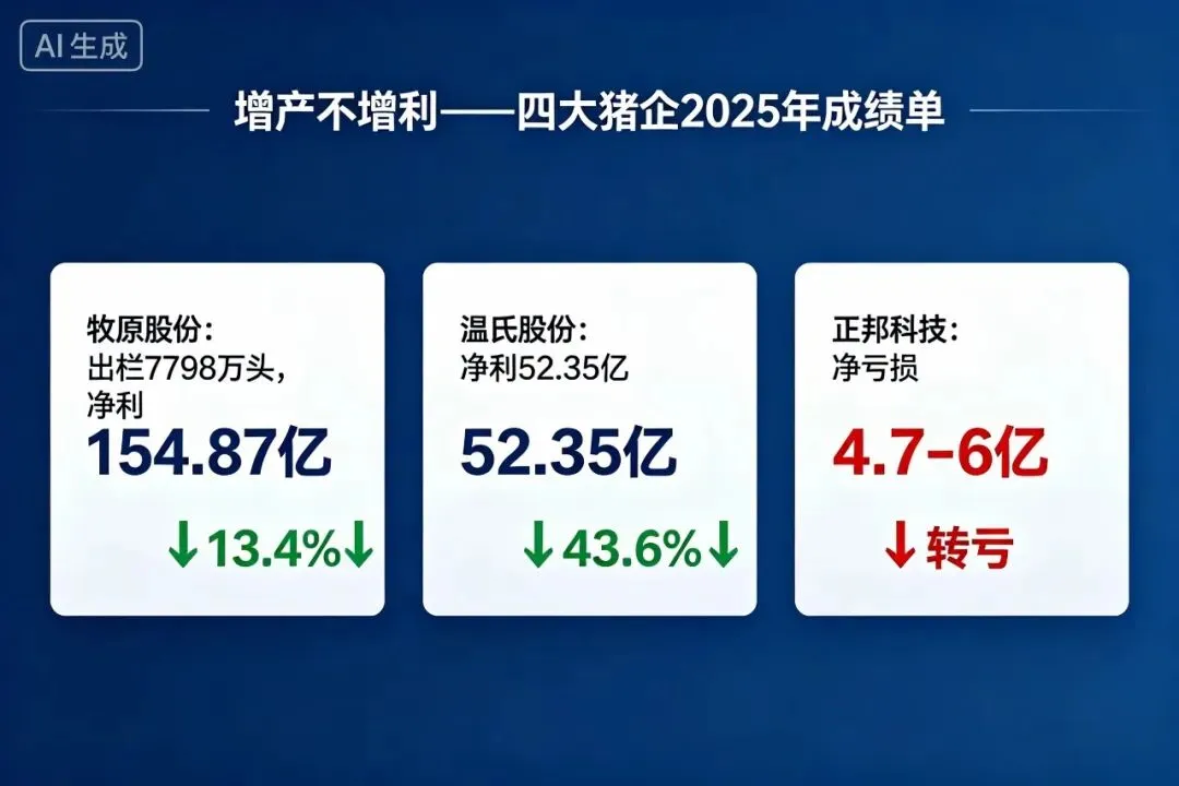 龙头企业也难以独善其身。牧原股份2025年年报显示,虽然实现7798万头历史出栏量、归母净利润154.87亿元,但同比下滑13.39%,四季度净利润降幅高达90%。温氏股份2025年净利润52.35亿元,同比下降43.59%。正邦科技预计2025年净亏损4.7亿-6亿元,由盈转亏。四家上市猪企2025年合计销售生猪1.4454亿头,较上年新增出栏2208.4万头,增产却未增利。