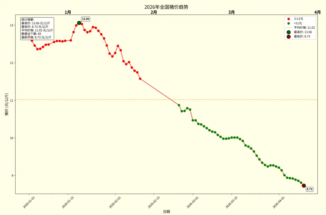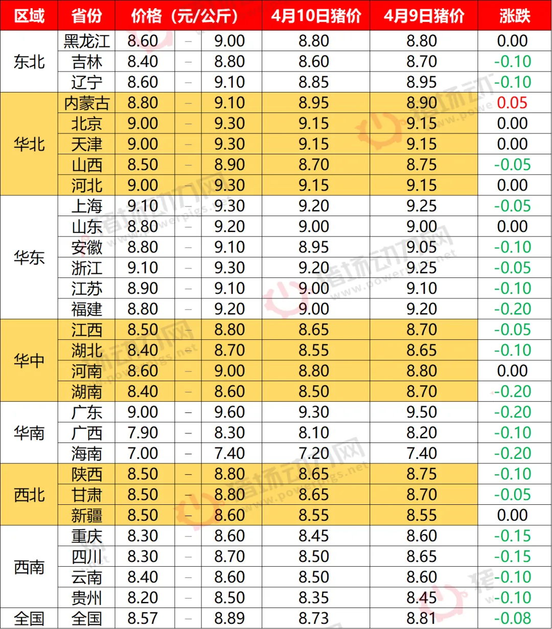 据统计,4月10日,屠宰企业散户主流收购120公斤-130公斤标准体重生猪平均价格为8.73元/公斤,较昨日价格下跌0.08元/公斤。20个省份猪价下跌,1个省份猪价企稳,1个省份猪价上涨。 目前全国最高价为广东,价格为9.30元/公斤,较昨日价格下跌0.20元/公斤;全国最低价为海南,价格为7.20元/公斤,较昨日价格下跌0.20元/公斤。