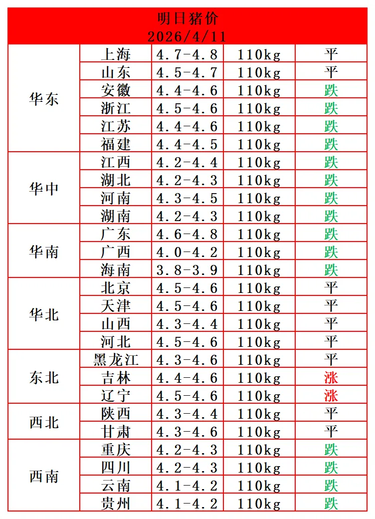 2026.4.11-今日最新猪价 养羊网 2026-04-11 2026.4.11-今日最新猪价 养羊网 2026-04-11 上一篇:2026年4月11号鸡蛋价格:否极泰来,蓬勃向上. 下一篇:【明日猪价】2026.04.12-全国明日最新猪价信息! 您可能还会对下面的文章感兴趣111: 相关文章 【猪价在线】2026-03-11全国各地区详细猪价信息!!!大力转发起来! 山间遇到吃草的山羊? 2025年4月13日全国各地生猪价格信息 没有膻味的羊肉