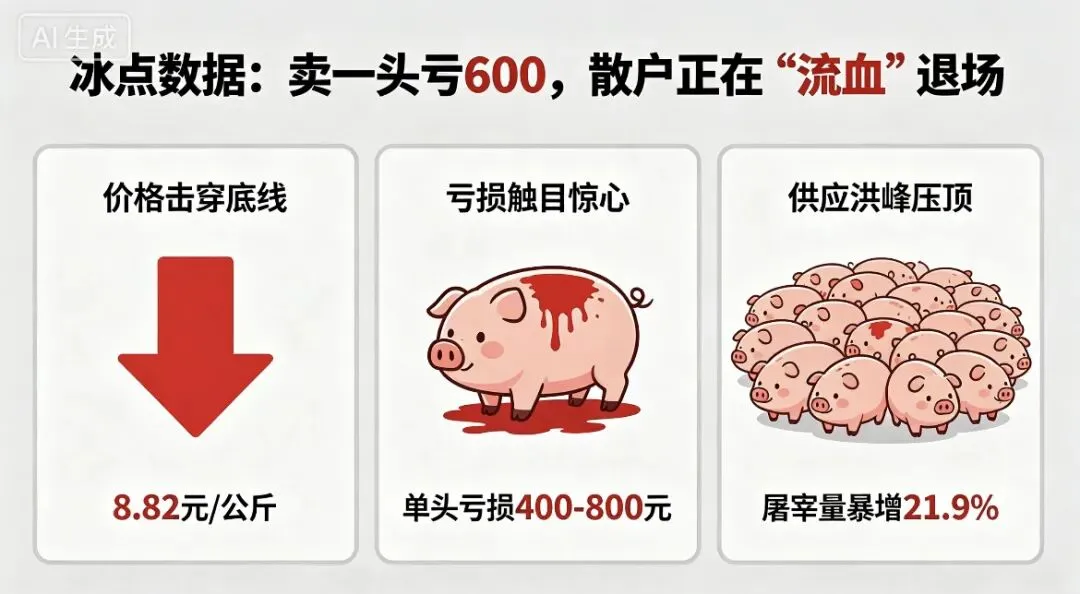 亏损触目惊心:自繁自养模式下,出栏一头猪平均亏损400-600元。对于成本控制较弱的散户,单头亏损甚至高达800元。这不再是养殖,而是“流血”经营。