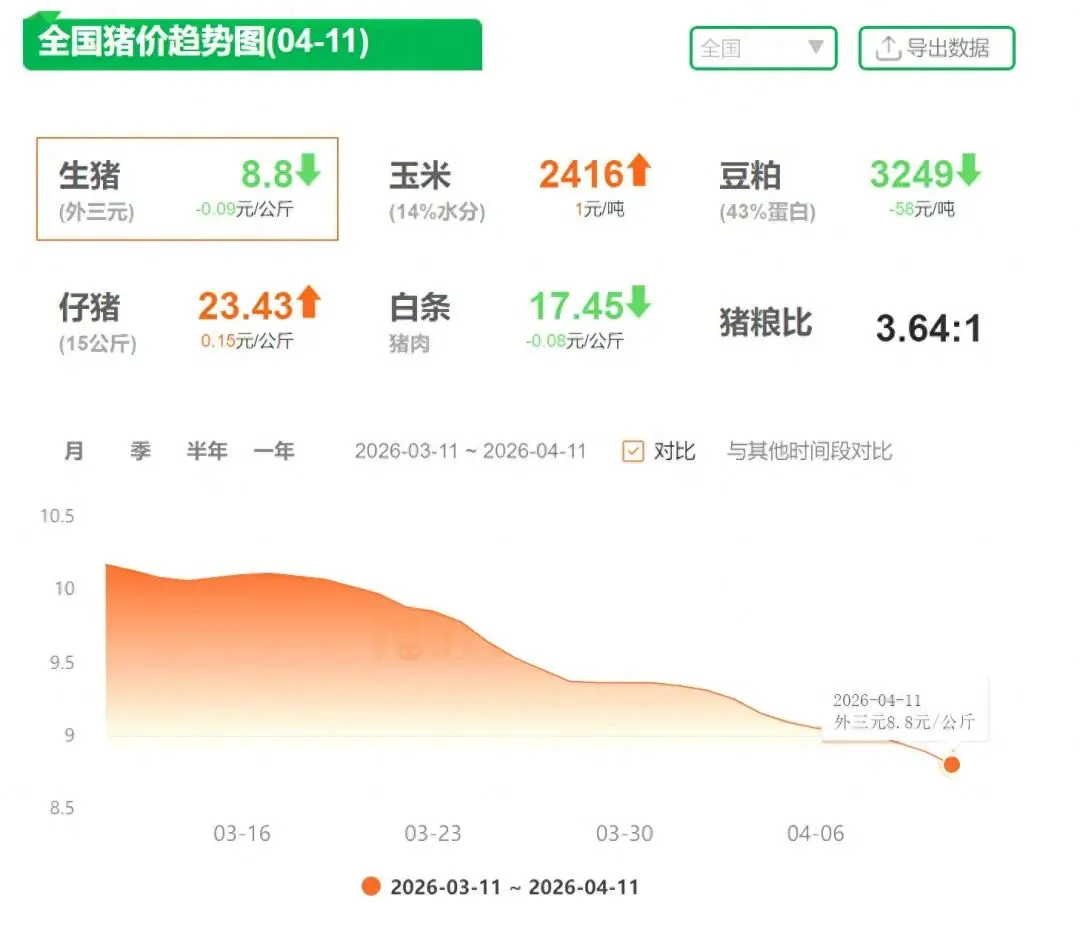 目前自繁自养每头猪亏损超400元,外购仔猪育肥亏损超500元,猪粮比跌至3.76:1,连续8周处于过度下跌一级预警,行业濒临“生死线”。