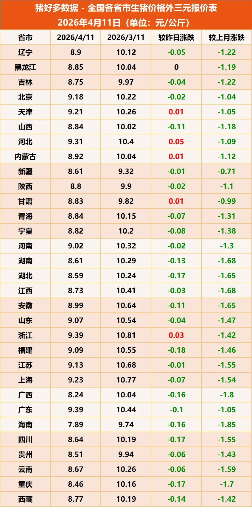 当前生猪市场寒意弥漫,猪价持续下行,养殖端深陷亏损,据猪好多数据监测显示,今日全国外三元生猪均价只有8.8元/公斤,较昨日再度下跌0.08元/公斤斤。其中。东北三省、西南、西北等地的猪价均已跌至9元以下,目前情况来看,每头猪亏损已超400元。“猪价是否触底”“何时反弹”成为行业焦点。