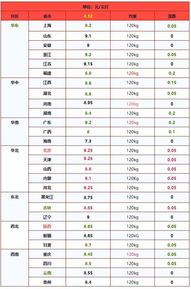国内南北各省区生猪价格一览表