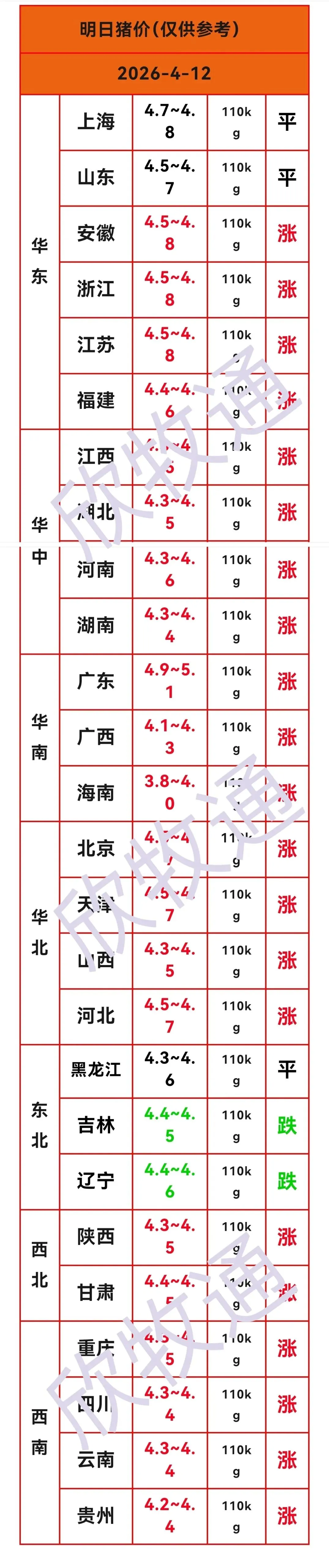 最新猪价(2026.4.12) 养羊网 2026-04-11 最新猪价(2026.4.12) 养羊网 2026-04-11 上一篇:明日猪价-2026年4月12日 下一篇:4月12日-明天猪价参考!(吉林4.2-4.65元/斤!有涨有跌,北方上涨!) 您可能还会对下面的文章感兴趣111: 相关文章 腊肠市场现在那么乱吗???? 这就是999的烤全羊 明日猪价 | 2026.3.7日~全国各地最新猪价(猪价已更新!) 一万元花一年2025第203天
