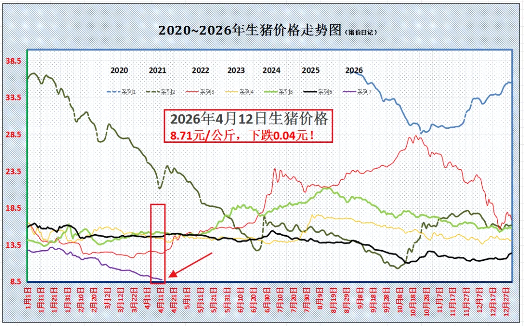 生猪价格承压,单边下跌!附:4月12日猪价4月渐入中旬,国内生猪市场,猪价继续承压,价格延续单边下降的走势!从最新消息了解,截至目前,外三元标猪触底8.75元/公斤,猪价重心跌破4.5元/斤后,价格维持震荡走弱的局面,短期内,猪价或难觅支撑,价格或将继续向下突破! 目前,生猪报价触及近10年以来最低水平,受此影响,国内猪粮比大幅下调,当前猪粮比不足4:1,降至3.73:1左右,生猪育肥处于深度亏损阶段,国内机构调研,自繁自养头均亏损在368元左右,但是,部分网友反馈,亏损幅度增加至500~800元/头左右,生猪市场陷入“黑暗时刻”,养殖端盼涨的情绪高涨! 支撑猪价下跌,主要受供需失衡延续,需求承接不足,而产能去化尚未完成,供强需弱凸显! 在供应端,本月,基于前期母猪存栏高位运行,且,产能效率显著提升,生猪供应进入集中兑现阶段。且,由于去年9月前母猪存栏变化幅度有限,主流观点认为,2026年上半年适重标猪供应月均维持高位,市场看涨后市缺乏信心。而随着饲料成本升高,生猪育肥压栏料肉比上升,且,气温升高加剧肥猪价格转弱,当前,生猪压栏性价比较差,亏损压力进一步加剧,养殖端多积极去产能!近期,集团以及散户猪场减重增量出栏,国内生猪出栏均重逐步回落,产能处于释放阶段! 在需求端,受限于周期性需求淡季,虽然,猪肉降价带动居民内销市场支撑转强,然而,由于饮食习惯的变化,市场替代品供应充足,居民肉类需求增量有限!虽然,近期,屠宰场集中入库现象增多,但是,随着冷冻猪肉库存高筑,进一步入库水平逐步下降,市场需求支撑仍显不足! 因此,在供应过剩以及需求承接不足下,国内猪价呈现滑坡下跌的走势,目前,市场尚未出现明显支撑,猪价或维持“磨底”的走势!不过,进入月末,随着五一假期临近,下游市场备货支撑或将转强,这或将刺激市场看涨情绪,带动猪价迎来“翘尾”的局面! 从最新数据分析,受屠宰场调价,预计,4月12日,外三元瘦肉型标猪出栏报价在8.71元/公斤,后市关注生猪购销节奏的变化,尤其是,集团猪企出栏以及下游二育情绪的变化。